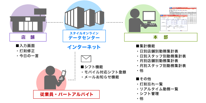 スタイルオンライン「勤怠管理ASP」はパートアルバイトの労働時間の集計を手間暇かけずに 日次で計算します。 また、携帯電話に対応したシフト管理機能や、予算実績対比など+α がうれしいワンランク上の勤怠管理ASPです。